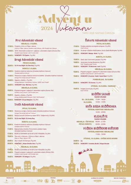 Advent u Vukovaru nije samo vrijeme iščekivanja Božića. Od 1. do 24. prosinca, šetnje uz Dunav pretvaraju se u bajkovite trenutke ispunjene tisućama lampica, mirisima kuhanog vina i zvucima blagdanske glazbe. Svaki vikend donosi nova događanja – od obiteljskih radionica i koncerata do tradicionalnih običaja koji podsjećaju na toplinu prošlih vremena. Ove godine, Advent u Vukovaru nudi program koji spaja tradiciju, zabavu i romantiku. Bez obzira na to dolazite li s djecom, prijateljima ili obitelji, moći ćete uživati u svakom kutku grada jer će baš svaki odisati blagdanskom čarolijom.