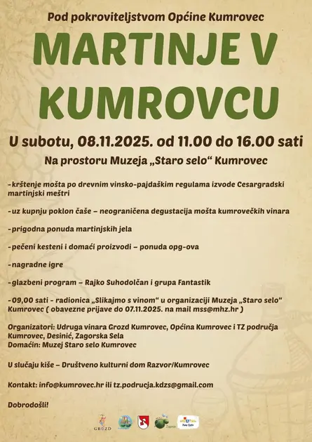 Martinje v Kumrovcu održat će se u subotu, 8. studenoga 2025. od 11 do 16 sati u prostoru Muzeja „Staro selo“, uz bogat program za sve generacije. Posjetitelje očekuje tradicionalno krštenje mošta prema starim vinsko-pajdaškim običajima koje će izvesti Cesargradski martinjski meštri, neograničena degustacija mošta kumrovečkih vinara uz kupnju poklon čaše, kao i prigodna ponuda martinjske hrane.