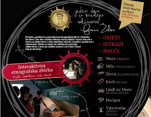 U bogato mlinarsko područje uvest će vas 3D film koji prikazuje s kakvim se razmišljanjima i događajima susretao mlinar budeći se još za mraka. Istražite sve o Muri i njezinim stanovnicima - dotaknite, pomirišite i sameljite žito, poslušajte međimurske "popevke“ i saznajte tko je Murska dekla.