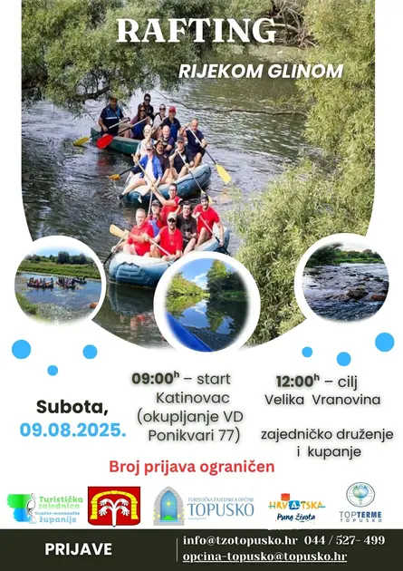 Rafting rijekom Glinom održava se u subotu, 9. 8. 2025. godine. Ova avantura pruža vam uživanje u netaknutoj prirodi, svježem zraku i zajedničkom druženju. Broj prijava je ograničen. Dodatne informacije i prijave na: info@tzotopusko.hr, opcina-topusko@topusko.hr ili na broj: 044 527 499.