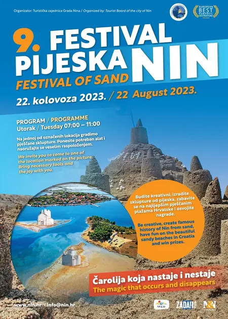 Na dvjema poznatim ninskim pješčanim plažama - Kraljičinoj plaži i plaži Ždrijac, idealnima za obitelji s malom djecom, u utorak 22. kolovoza održat će se prava 'fešta od sabuna'. Tamo će se pod vodstvom umjetnika i kipara graditi kule i skuplture od pijeska. Festival pijeska je mjesto neobičnih susreta kupača i graditelja kula od pijeska koji će svojim umijećem od ranog jutra u 7 pa do ocjenjivanja u 11 sati stvoriti nove pješčane građevine kao rezultat svoje kreativnosti i mašte. Najljepše skulpture bit će nagrađene, a organizatori će se pobrinuti za dobru zabavu i opuštanje na plažama kraljevskoga grada Nina.