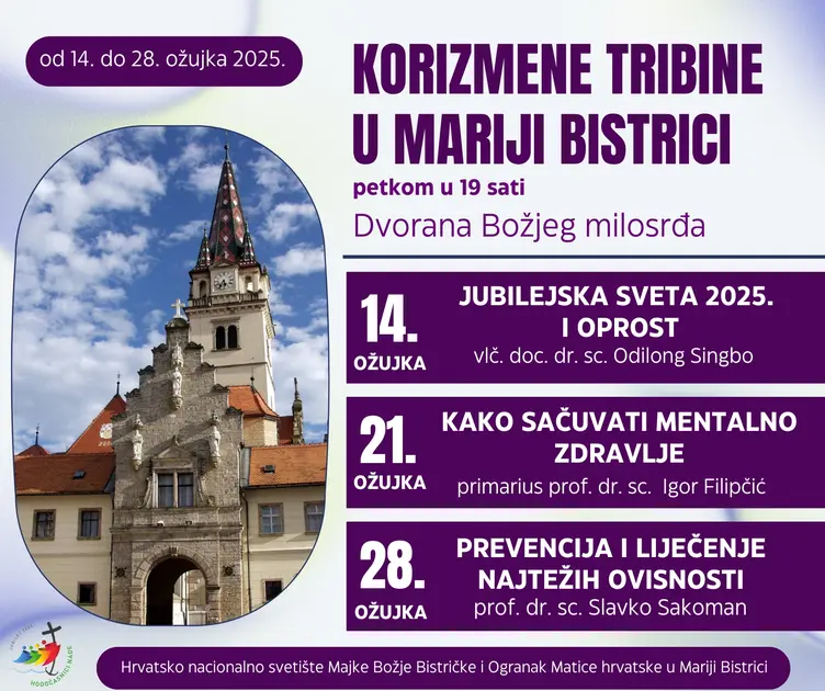 Ogranak Matice hrvatske u Mariji Bistrici i Hrvatsko nacionalno svetište Majke Božje Bistričke nastavljaju dugogodišnju tradiciju korizmenih tribina, na kojima nas ugledni intelektualci potiču na razmišljanje o važnim društvenim i duhovnim temama.