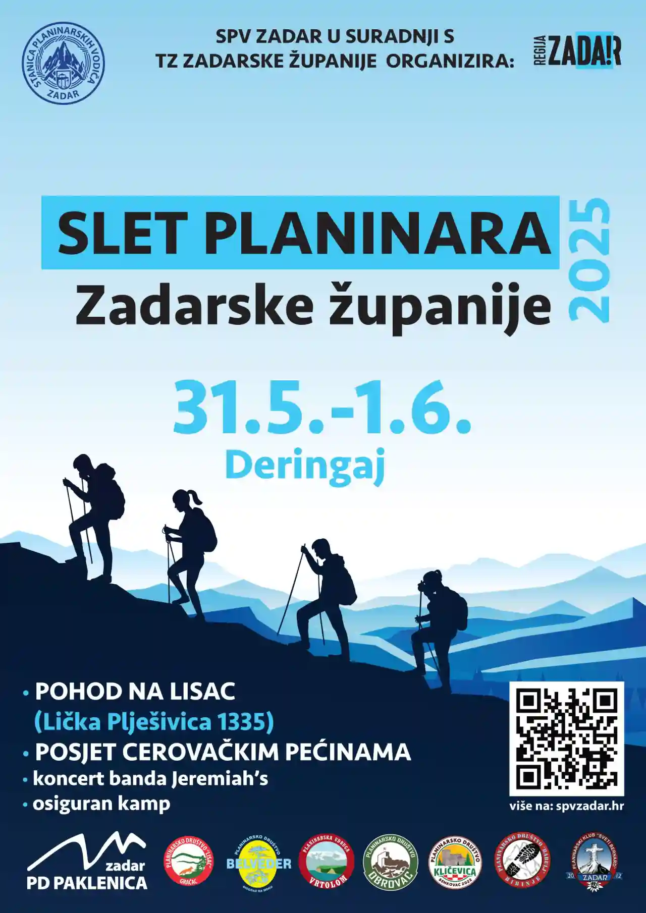 SPV Zadar u suradnji s TZ Zadarske županije organizira Slet planinara Zadarske županije, koji će se održati od 31. svibnja do 1. lipnja 2025. u Deringaju. Sudionike očekuje pohod na Lisac, posjet Cerovačkim pećinama, koncert benda Jeremiah’s i osiguran kamp