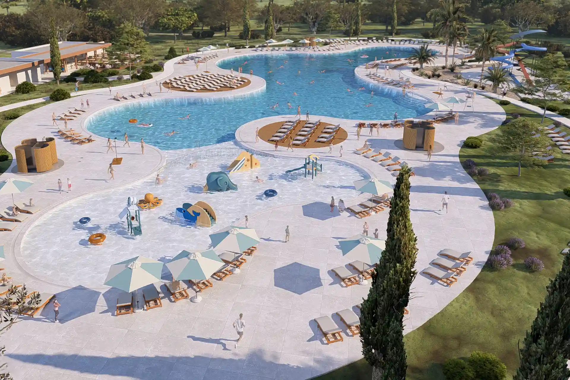 Bazenski kompleks od 2.500 m² uključuje dječji bazen od 300 m² sa šest uzbudljivih atrakcija i dva fantastična vodena tobogana